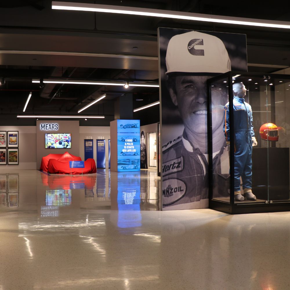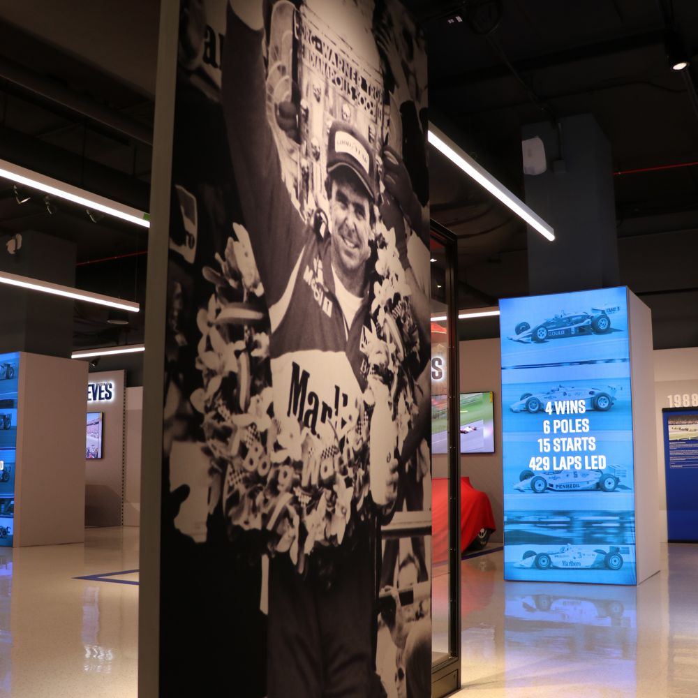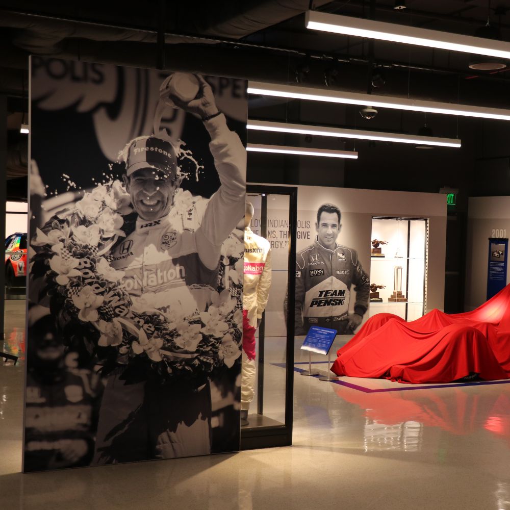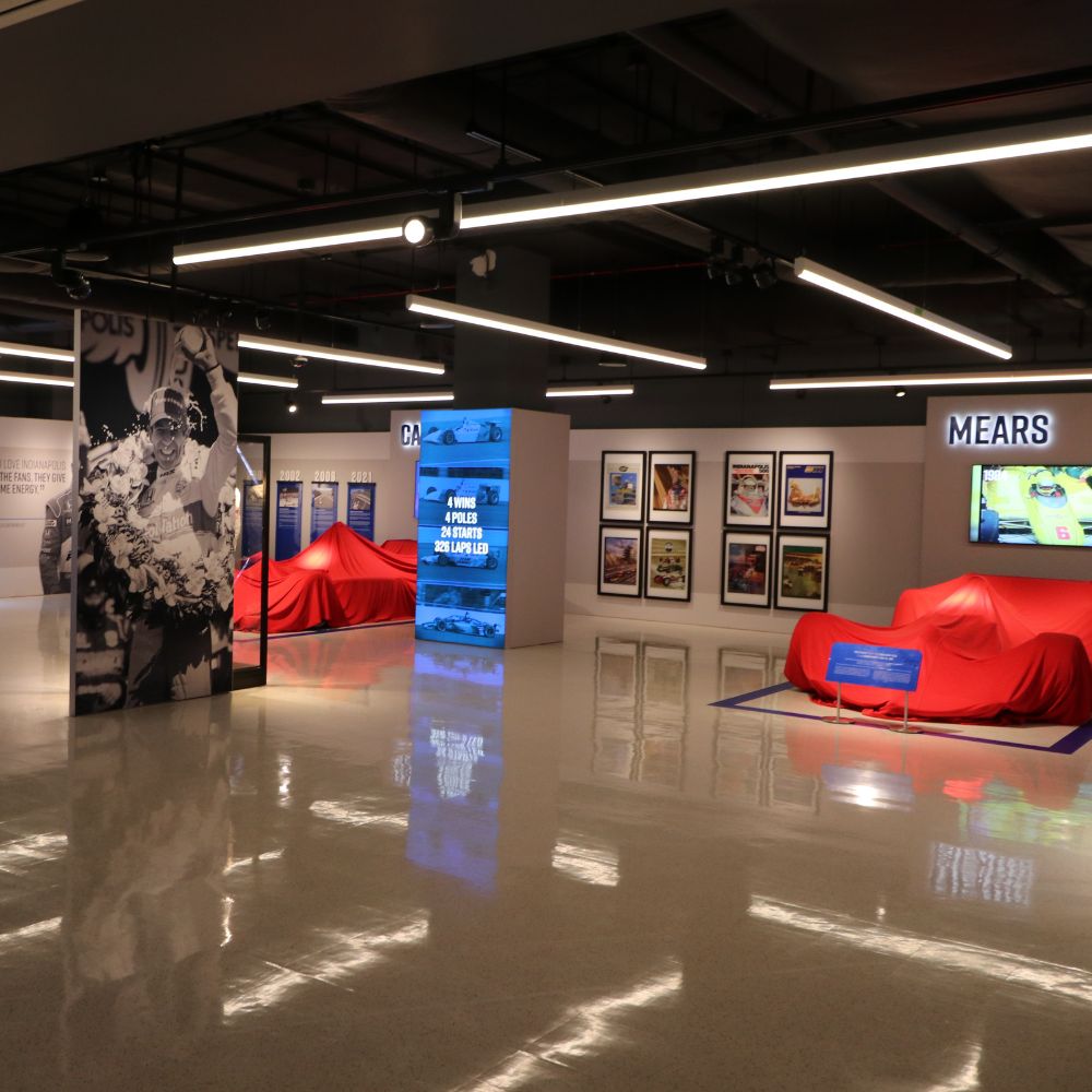 Partnering with Interpretive Planner Mary Seelhorst, the exhibit profiles legendary drivers A.J. Foyt, Al Unser Sr., Rick Mears, and Helio Castroneves. The space features an array of vibrant fabric graphics, curated digital engagements, immersive photo opportunities, and a variety of artifacts, including four race-winning cars.